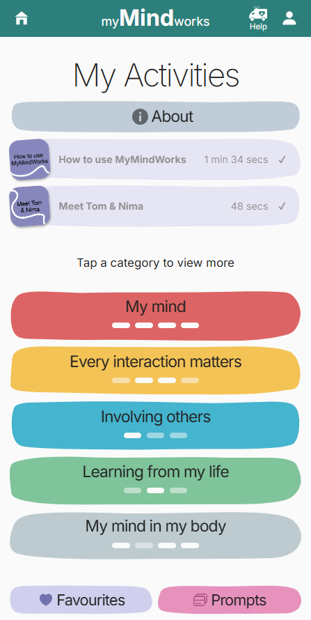 The MMW program design makes it easy to go back and forth. There is a section for noting ‘favourites’ to return to. Two trained NHS BPI practitioners talk on video in various sections of the program about mood disorder and encourage the adolescent to complete MyMindWorks in their own time and their own way.